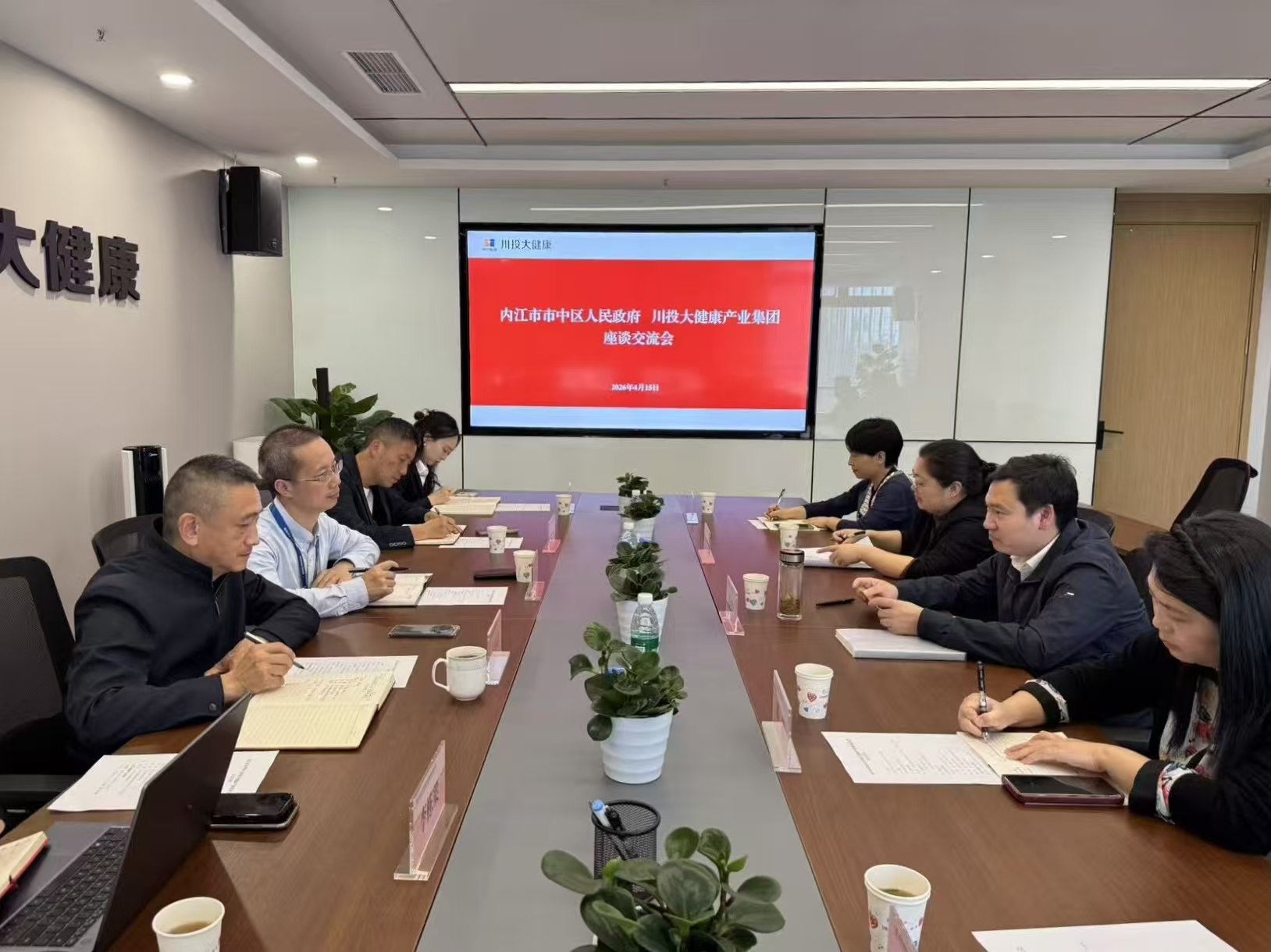 4月15日,内江市市中区委常委、区人民政府党组成员、副区长邹河旺带队到大健康产业集团座谈交流,大健康产业集团党委书记、董事长、总经理周家超主持会议。