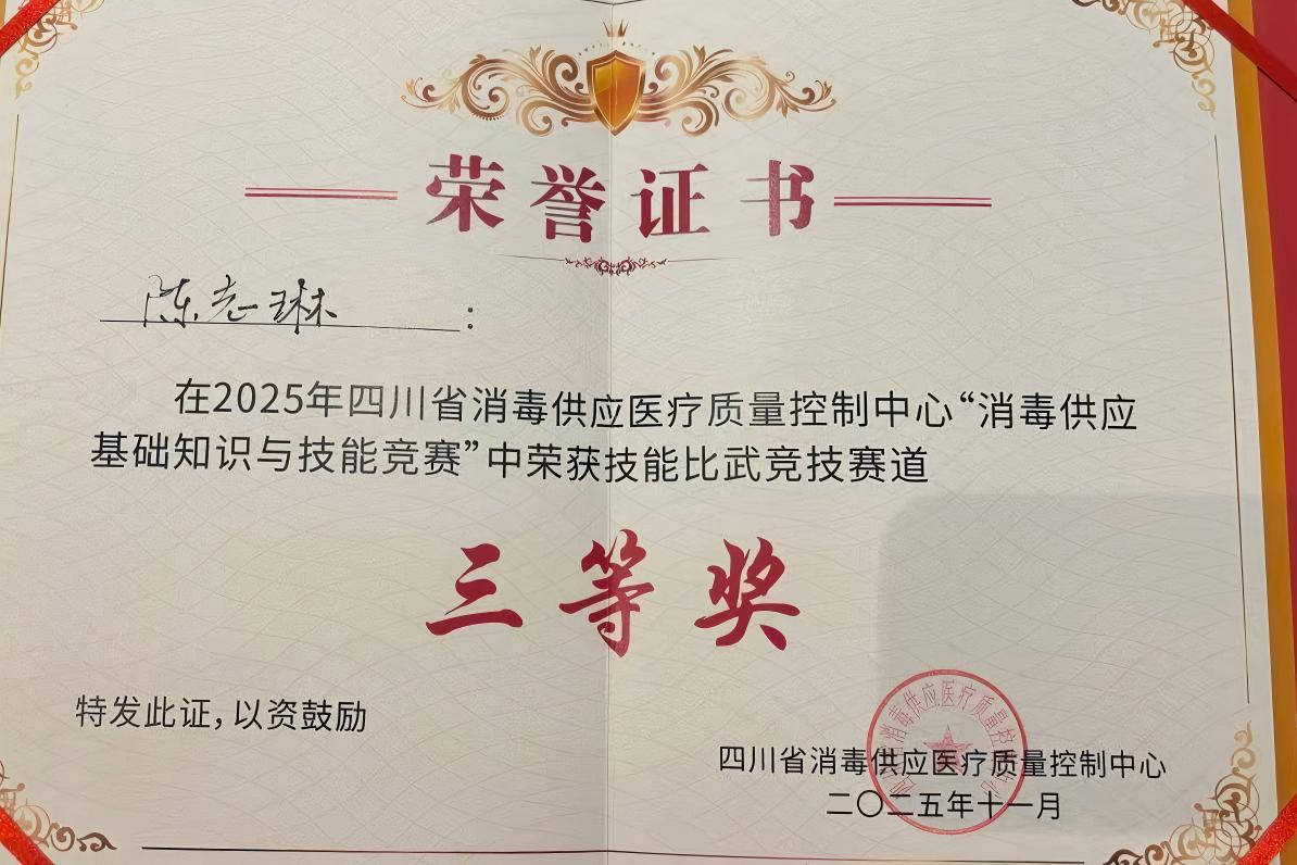 近日,川投西昌医院消毒供应中心护士陈志琳在“四川省消毒供应医疗质控中心”主办的“消毒供应基础知识与技能竞赛”中,凭借扎实的理论功底与娴熟的实操技能,荣获“技能比武竞技赛道”三等奖,充分展现了川投西昌医院消毒供应团队的专业素养与过硬实力。