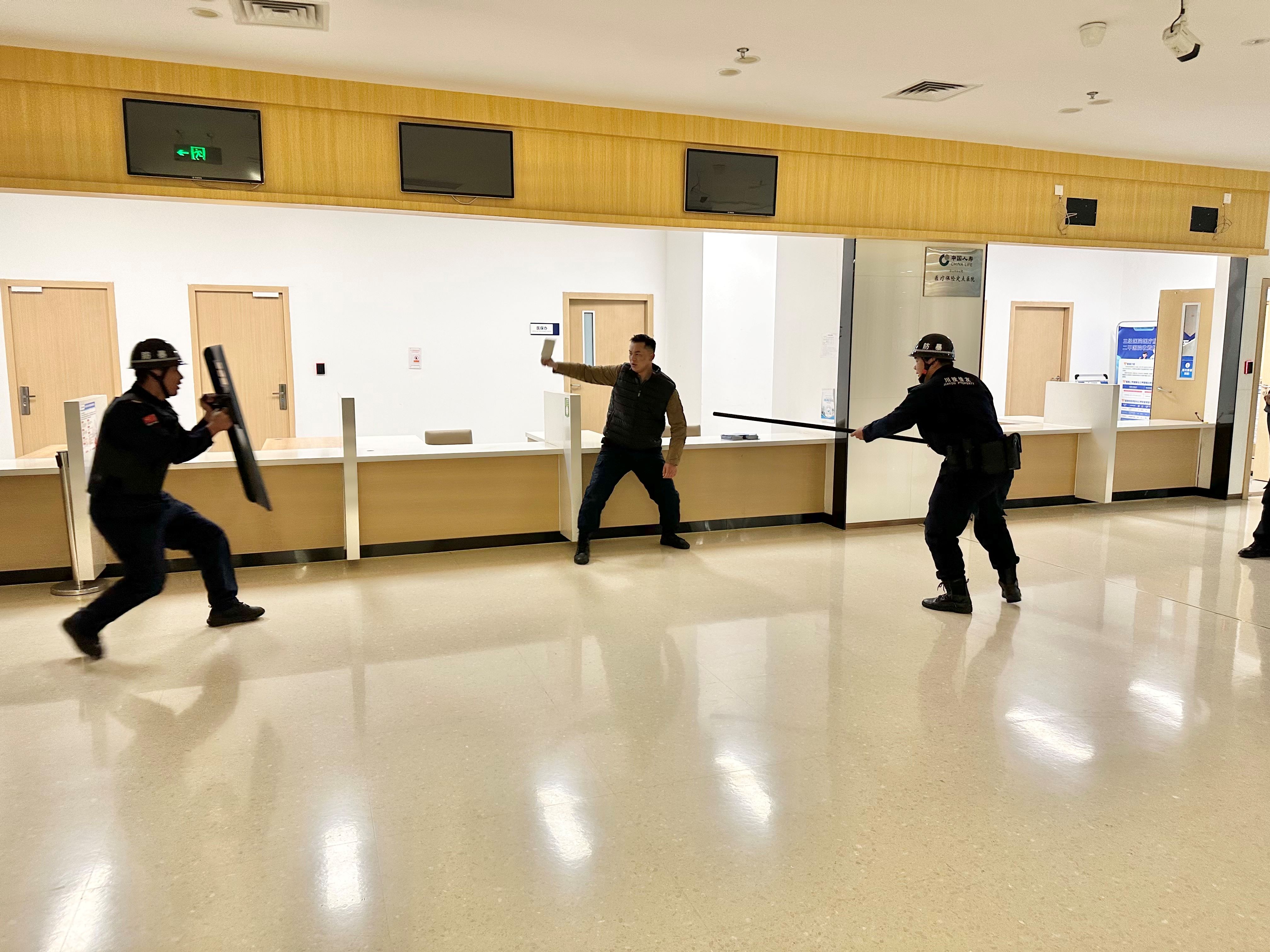 演练模拟川投西昌医院出入院办理处场景:一名暴徒因不满就诊服务,辱骂医护人员后,手持管制刀具砍伤窗口工作人员,并试图继续施暴。出入院办理工作人员立即启动一键报警后,在窗口内进行紧急避险。医院立即启动《突发治安安全事件应急处置预案》及《突发事件院内人员紧急疏散预案》。