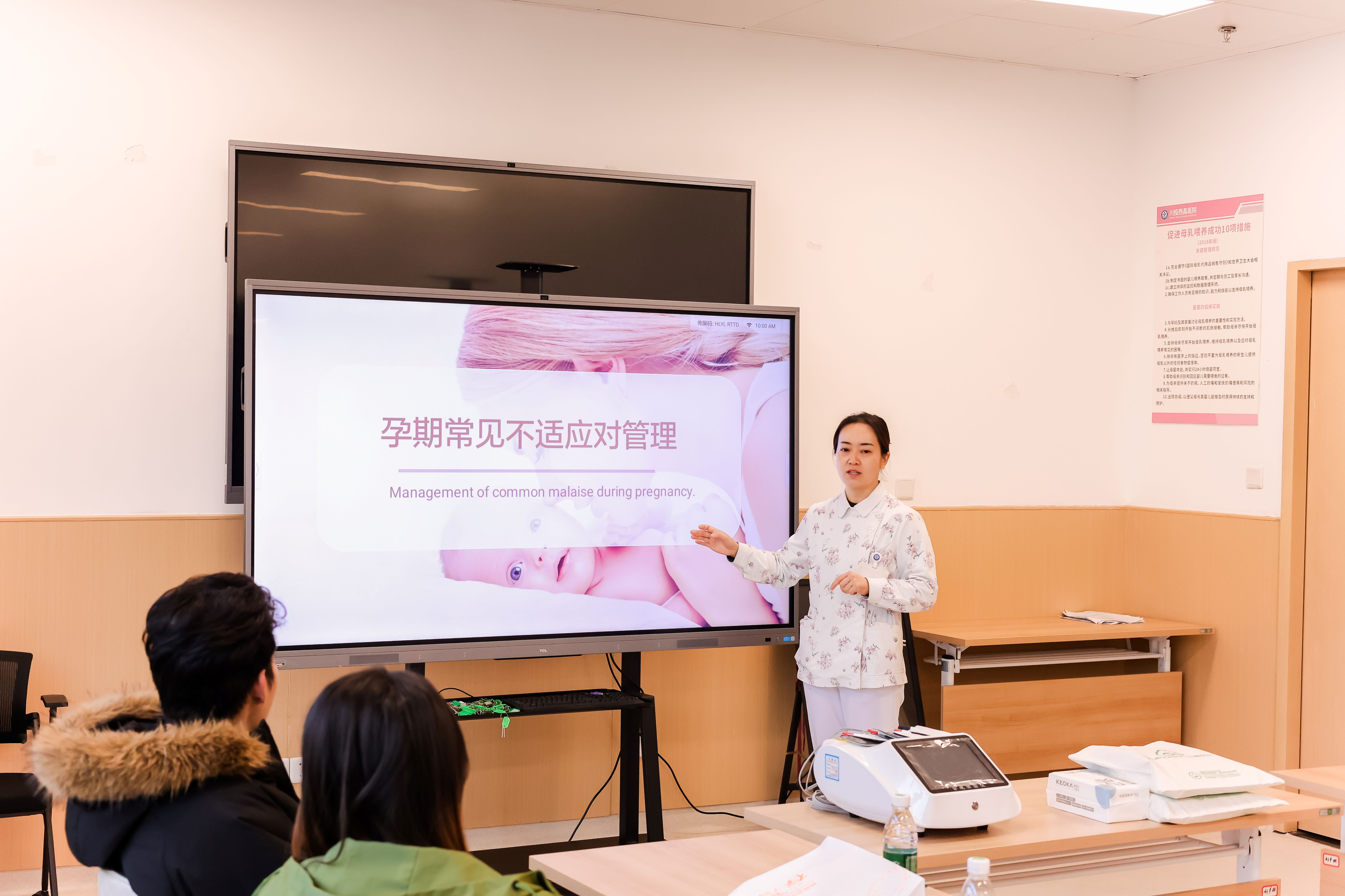 “孕期不适是很多准妈妈都会遇到的问题,比如腰酸背痛、下肢水肿等,而适当的按摩和运动能有效缓解这些症状。”妇产科护士长在课堂上首先强调了孕期保健的重要性。在理论授课环节,医护人员用通俗易懂的语言,围绕孕期生理变化、营养搭配、分娩信号识别、产后护理等关键知识点进行了详细讲解,为准妈妈们系统梳理了孕期的注意事项。