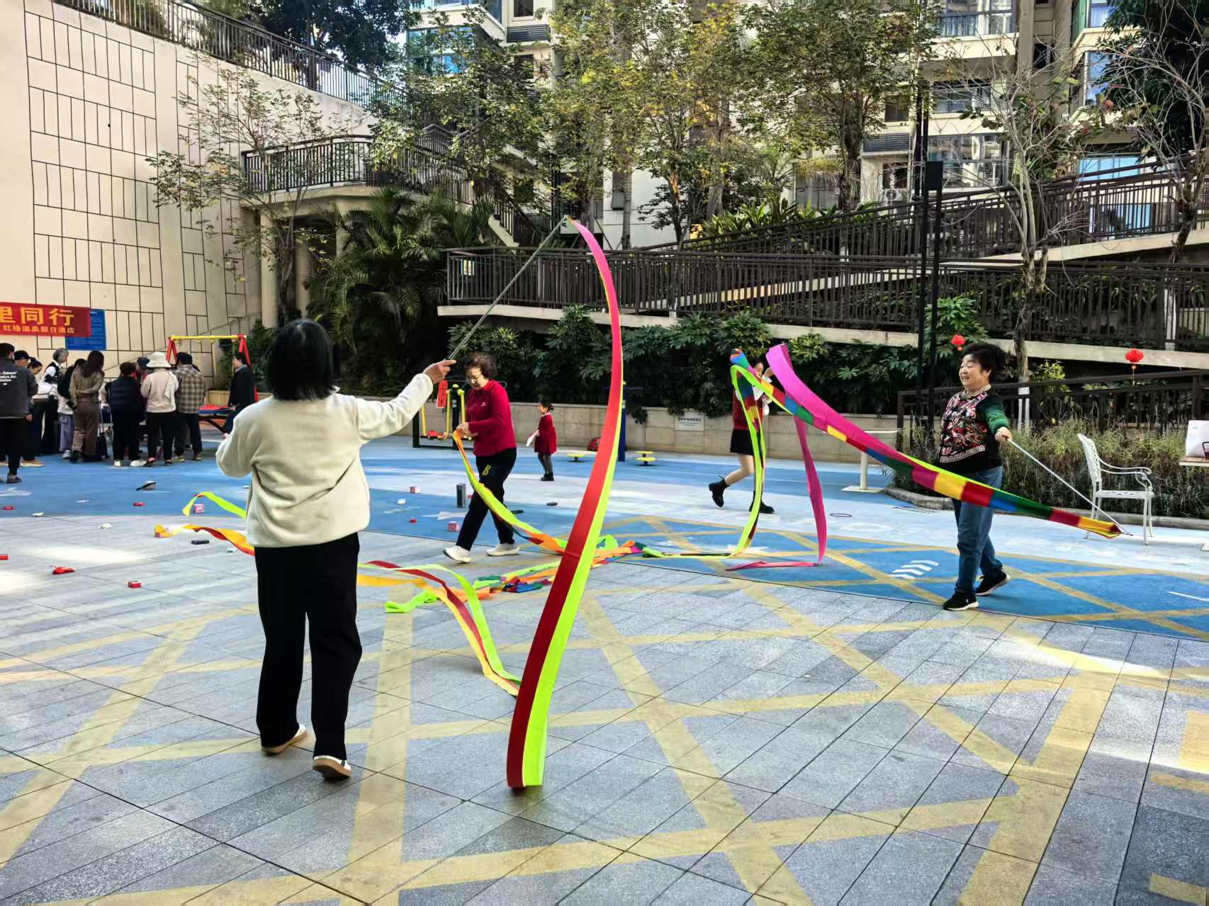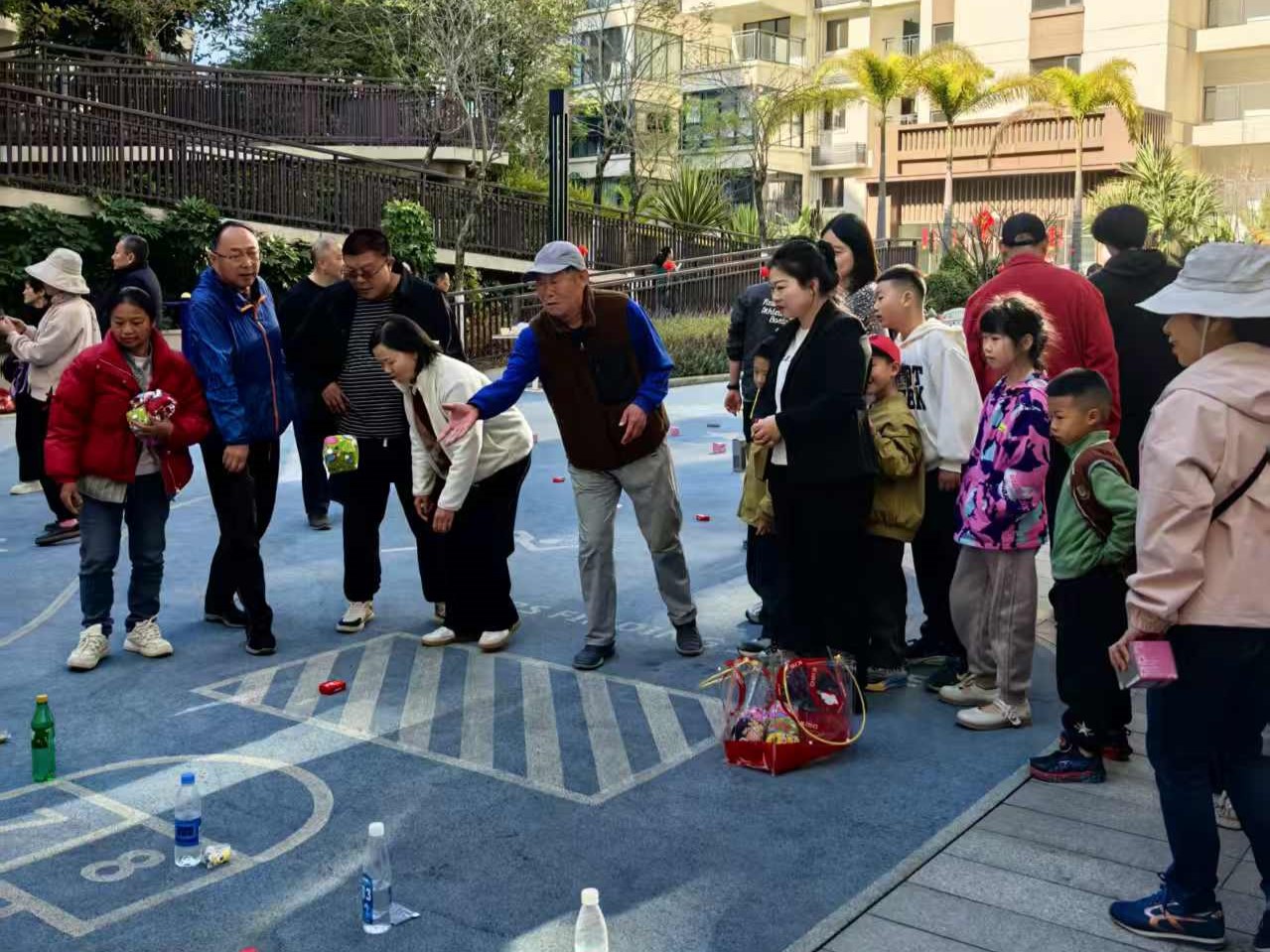 本次喜乐会设置传统年味体验、怀旧游戏互动、欢乐棋牌竞技、邻里共舞迎新春四大环节,兼顾不同年龄段业主需求。传统年味体验中,春光里物业服务中心免费提供暖心汤圆,还为独居行动不便老人上门送汤圆;小区书法爱好者现场书写福字、春联供业主领取,亲子DIY福字贴活动趣味十足,马年心愿墙更是让业主们定格新年美好期许。怀旧游戏区里,欢乐打沙包、好运套圈圈人气高涨,业主们在互动中收获欢乐与礼品。棋牌竞技环节,麻神大赛、象棋赛、双扣比赛轮番开展,参赛业主切磋技艺,优胜者赢得电饭煲、保温杯等奖品。当邻里共舞环节压轴开启时,在喜庆的旋律中,业主们自由参与、随乐起舞,将现场欢乐氛围推向顶峰。