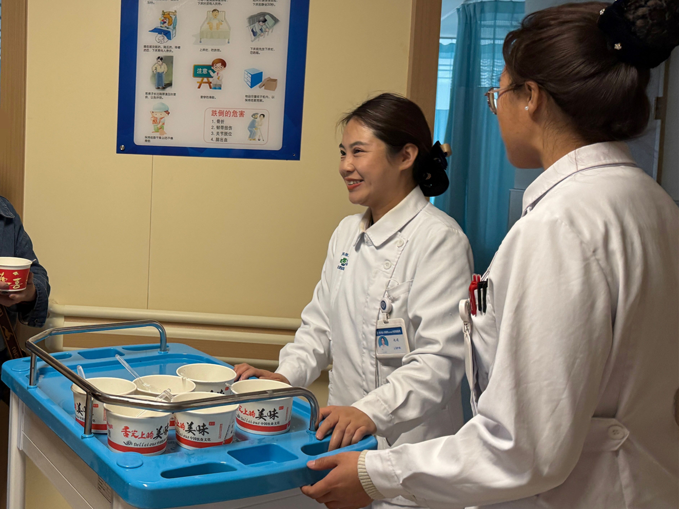 “大爷,祝您元宵节快乐,早日康复!这碗汤圆是无糖的,您放心吃。”“小朋友,慢点吃,甜甜蜜蜜过元宵!”……伴随着温暖的问候,医护人员推着满载汤圆的餐车,走进每一间病房。他们亲手将热气腾腾的汤圆送到患者和家属手中,一边叮嘱着饮食注意事项,一边耐心询问患者的恢复情况,细致的关怀让病房里暖意融融。